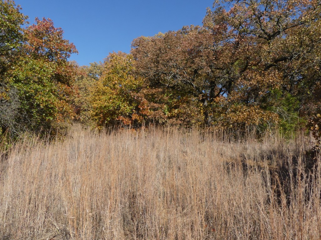 I sat beside the pond, looking at the line of trees outlined by a pure blue sky. The glossy green blackjack oak leaves were turning a mixture of caramel and ruddy red. In front of the trees was a stand of little bluestem, a native grass with subtle beauty. Each starts with a little clump of narrow, curled leaves at ground level, sending several tall stems to reach chest high. The tiny seeds along those stems are feathery, and in autumn sunlight they are like a constellation of stars scattered among the grasses. Altogether a lovely little spot on a fine late autumn day.