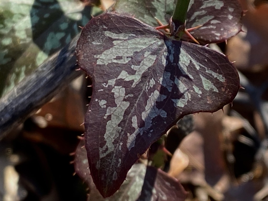 Greenbrier leaves are usually mottled, and in winter the leaf may become dark and purplish while the mottled areas remain green. It occurred to me that each leaf was a small bit of abstract art, and that we could let our imaginations go and see if the patterns suggest something, sort of like Rorschach ink blots. Go ahead, see what comes to you when you look at the pattern. I love the way it splatters out from the central vein.
