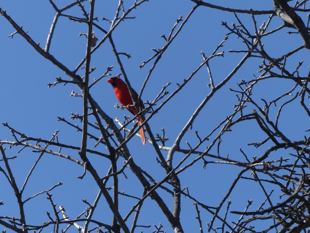 Here at Sheri Capehart Nature Preserve, I can sit on the ridge and look down into the brown and gray woods, still in those colors for a while before the leaves appear. There are some glimpses of green, bits of juniper seen through oak branches, and patches of moss at the base of tree trunks. And there is a flash of reddish feathers from a female northern cardinal.