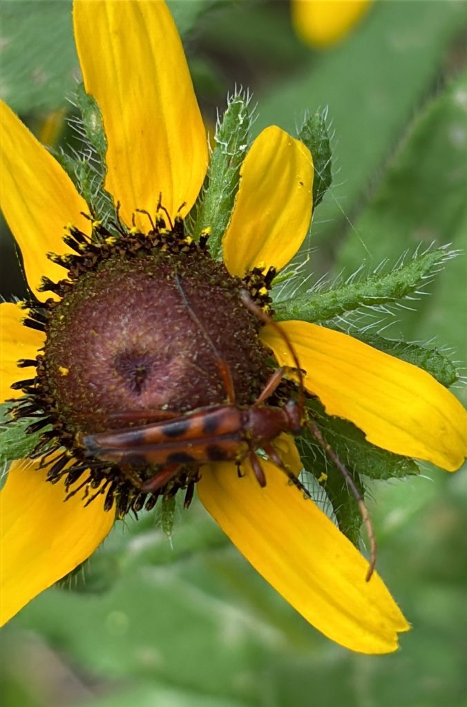 Continuing around the preserve, I found a tiny juvenile bush katydid with black-and-white banded antennae on the flower of a Lanceleaf Blanketflower, and then a Six-spotted Flower Longhorn Beetle crawling over a Black-eyed Susan flower. On a walk like this, the insects provide so many fascinating forms and colors.
