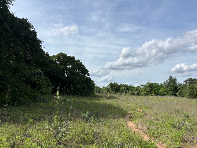I expected no particular answer, but I did hear calls of Bewick’s Wren, Northern Cardinal, Red-bellied Woodpecker, Blue Jay, and Painted Bunting (identified by the Merlin app), and those calls felt welcoming. Low clouds covered most of the sky, and it was a little like being draped in a warm, wet blanket. Weather Underground said it was 81F and 76% humidity in the area.