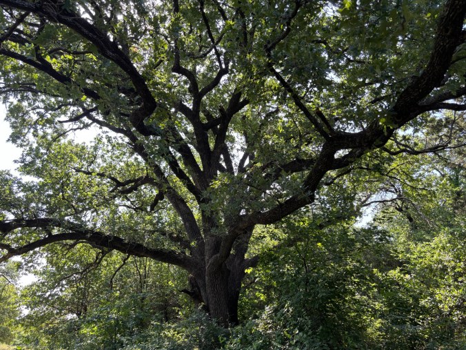 And that brought me to the Old Man (Old Woman, if you like) of the preserve, a huge Post Oak that the Texas Tree Coalition designated as a Historic Texas Tree in 2019. It is called the “Caddo Oak,” in honor of the Caddo People who once lived here. After more than 200 years it continues to stand, with a huge trunk and massive branches stretching out like arms to embrace the sky.