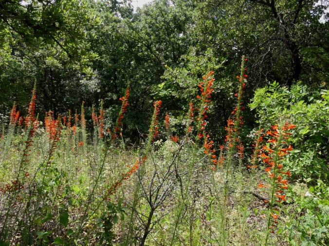 And the Standing Cypress is having such an amazing year at the preserve. You first see them in winter, growing as a delicate rosette of thin, fern-like leaves. But in spring the plant sends up a tall stem that can grow up to six feet, with a flower spike at the top that produces clusters of red, tubular flowers.