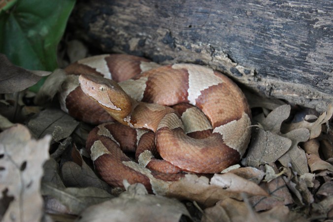- Wildlife. Most of the larger wildlife at LBJNG is no cause for fear. Coyotes live there, but you are more likely to hear them than to see them. If you see a coyote that stands its ground, especially in spring during pupping season, you should back away and leave the area. More information about interactions with coyotes can be found here. Feral pigs are seen in some areas, and while they usually run away, they are potentially dangerous. Avoid them, especially sows with young pigs. We should keep a respectful distance from wildlife, even deer. There are two species of venomous snakes that are common in suitable habitat within the grasslands. These are the Northern Cottonmouth (also called the water moccasin) and the Broad-banded Copperhead. Cottonmouths typically are seen near the bigger lakes and ponds. Through most of the year, copperheads are primarily active at night. If left alone both species will avoid interacting with people. Don’t put your hands under rocks or logs where one may be concealed, and watch your step. More information about these snakes can be found here.