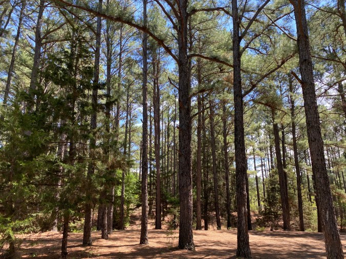 In several spots within the grasslands there are areas dominated by Loblolly Pines. They are generally in areas of deep sand with one or more ponds and are popular with campers. Pine trees are not a typical part of the Cross Timbers plant communities, and we have been told by Forest Service staff that pine seedlings were brought to the area 40 or 50 years ago and planted. Today many of the trees have grown quite tall, and smaller trees and seedlings show that these pine groves are well-established and even expanding.