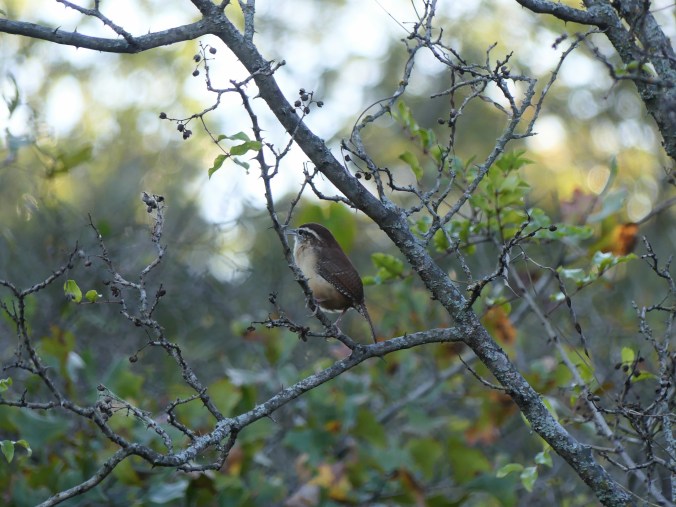 Merlin, the bird identification app, identified them as a Northern Cardinal and a Bewick’s and a Carolina Wren. Meanwhile somewhere there is a Carolina Chickadee and a Blue Jay. After a short time, the nearby birds have gone quiet. Was it just a brief stopover? Or have they finished saying what they had to say? What were they communicating, and to whom? Inviting someone in, or maybe telling someone to stay away?
