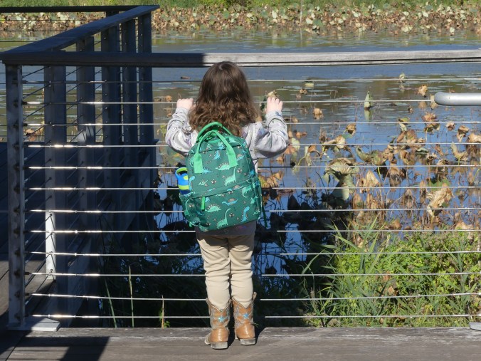 After seeing the bison, Lilly and I went to the marsh boardwalk. A marsh is a place with fairly shallow water and plants that grow out of that water. This one is a lotus marsh, with many big round lotus leaves. It’s getting toward late autumn, and so lots of the leaves are turning brown.
