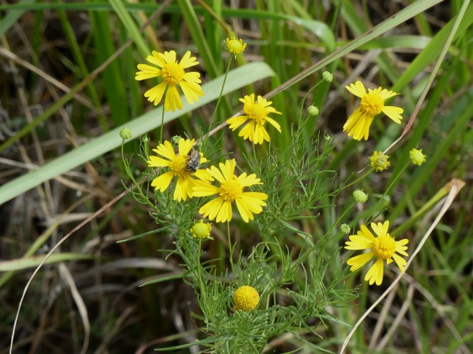 At the fork in the trail, I turned and followed the bare sand and clay track to the north, through stands of Post Oak and Eastern Redcedar and out into grassland openings, grateful for the breeze as well as for the bright sunshine. Along the trail were clumps of Bitterweed, with thin leaves and stems and bright yellow flowers. In each of those flowers, the central bowl-shaped disc is full of tiny yellow disc florets, and arranged around it are the ray florets (most of us are taught to call these structures the “petals”), each one scalloped at the edge. The plant is said to be bitter, so that if cattle must forage on them the cows produce bitter milk. But Bitterweed is a familiar and welcome sight to me, and I often find them blooming deep into winter.
