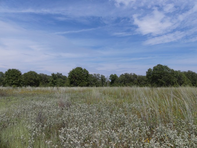 This day at the grasslands would get no hotter than the mid-90s. That’s how warm it was at 2:00pm when I arrived at a trail taking me into open fields and oak woodlands. There were patches of prairie dominated by Wooly Croton, a slightly fuzzy plant whose seeds are sought by doves, among other birds. And so, another common name for it is Doveweed. It is also a host for caterpillars of a beautiful butterfly with the strange name Goatweed Leafwing. Accordingly, another name for this plant is Goatweed. All those names can get confusing (it’s also called Hogwort by some) but the names tell interesting stories. In other areas, Western Ragweed was common. Allergy sufferers may wince at the mention of this plant, but consider the scientific name of its genus: Ambrosia. It may not literally be the food of the gods as the name suggests, but if you crush a leaf between your fingers, the smell is wonderfully aromatic.
