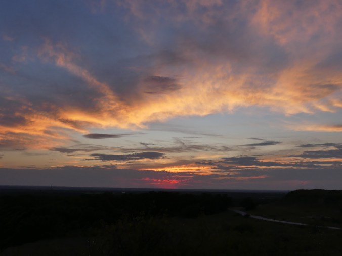 At 6:00pm I had moved to a limestone ridge in Unit 71, with a clear view to the west. Here, the Leavenworth’s Eryngo adds some spikey purple to the landscape, and False Gaura is scattered around with flower clusters looking like popcorn waving in the breeze. During the next hour, the sun was obscured behind some clouds near the horizon and it began to feel like the day was ending. Although there were some distant noises, a pump somewhere, an occasional car or jet, it seemed very quiet. No sounds of birds or insects. In the blue sky to the south, a few wispy clouds were drawn out like a downy feather.