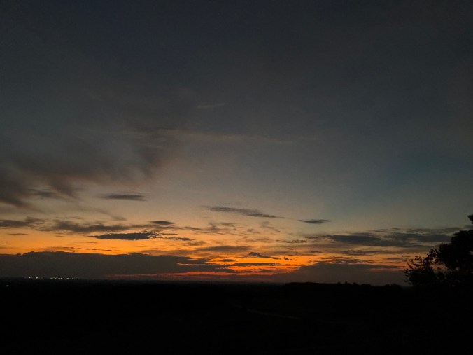 Ten minutes later, a cool breeze came up, steady this time. With it, the beginning of a pulsing, buzzing insect song. The last burning ember of the sun disappeared at 7:37pm, leaving a brilliant sky. The edges of the clouds were left like burning scribbles, and closer to me the undersides of clouds were lit in gold. Even the tattered clouds overhead were lit up in yellow-orange. Just a bit later, looking back from the west the clouds were blue-gray brush strokes edged in pink and orange. The sky was deep blue overhead but pastel all the way around the horizon, perhaps from light pollution and haze.