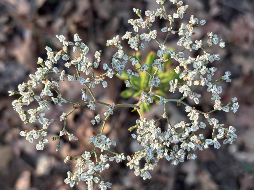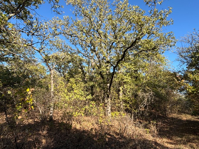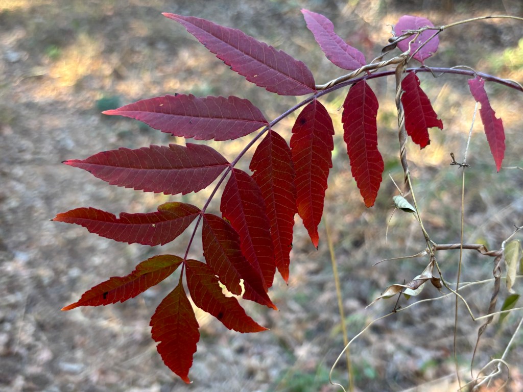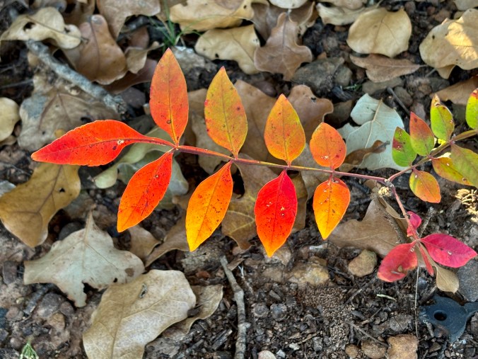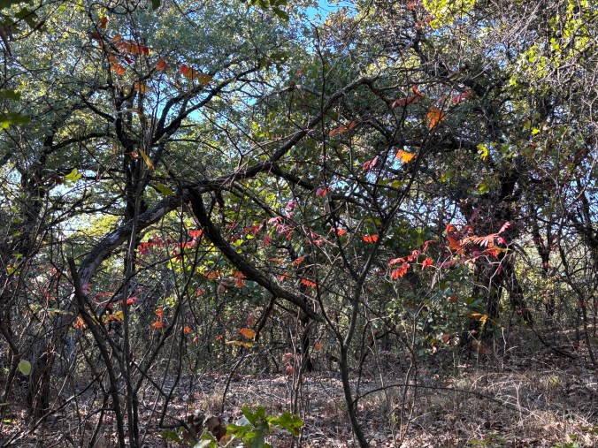 Starting at 3:00pm under sunny skies, I walked up to the top of the hill and sat down to watch, listen, and write a little. it was 82.7F in the shade, with the crowns of post oak trees still covered in green leaves and swaying in the breeze. A little sumac shrub in front of me was brightly backlit by the sun in vibrant green with a little red. Other sumacs had mostly just dropped their leaves, skipping the part where they might live up to names like “flameleaf.”