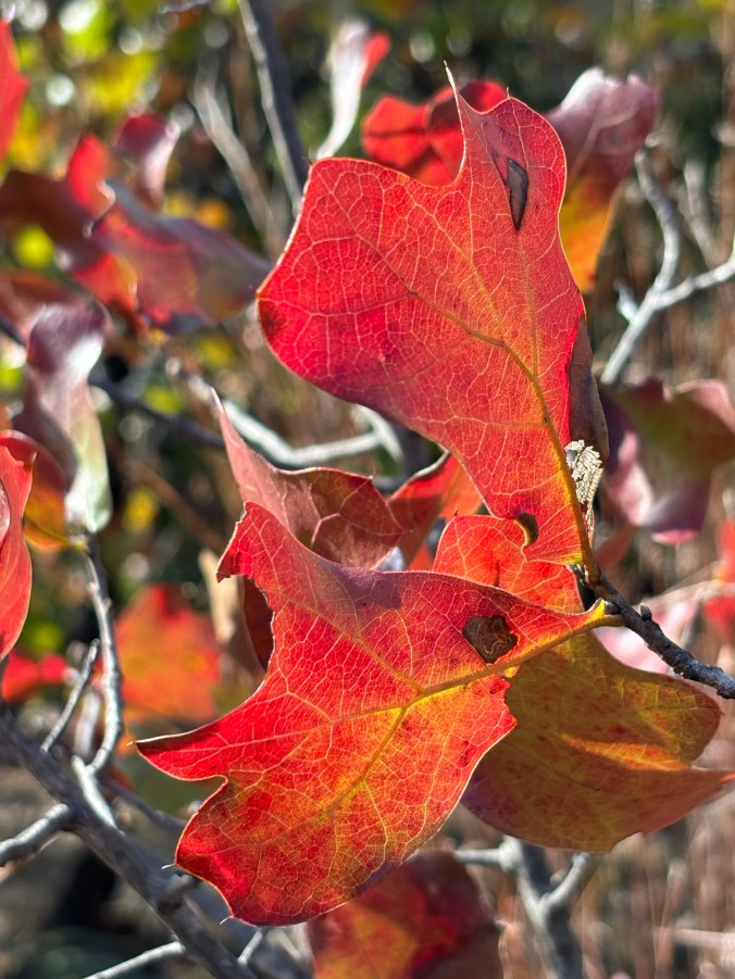 Even without a lot of fall color, there were places where the bright, slanting December sunlight backlit a group of leaves and created a dramatic display of color. Going slow, we can notice so many small and wonderful things.
