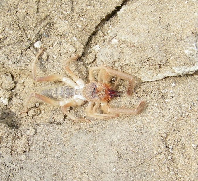 I’ve seen them in West Texas though, and they are fast and have very powerful jaws. Reassuringly, they have no venom, just those big mandibles – two on top and two beneath. They can bite and chew up invertebrates and even small vertebrates. Solifugids have a variety of common names, like wind scorpion or sun spider, though they are neither scorpions nor spiders. They have their own group (their own order) within the class Arachnida.