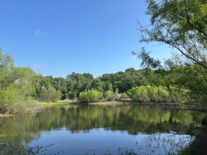 We needed the trails to be walkable for the party that evening, celebrating frog calls of north Texas. A wonderful group of folks gathered at 8:00pm and I played recordings of our toads, treefrogs, true frogs, and cricket frogs. And the Blanchard’s cricket frogs at the south pond joined in, giving us a nice chorus of “grick-grick-grick” multiplied by a good number of frogs. That resulted in a call index of 3, using the system developed for rating the intensity of frog symphonies and song cycles. So many frogs calling that their voices, for a little while, were continuous and overlapping.