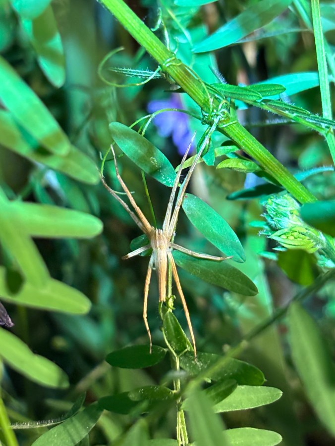 Another was a spider I thought I recognized from hanging out with spider expert Meghan Cassidy. One of the spiders she photographed and we used in the Mindfulness in Texas Nature book was a small nursery web spider so obscure that it’s known only by the scientific name Pisaurina dubia. Yet another of the small and inoffensive spiders of the preserve.