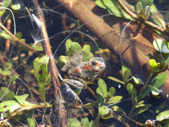 As we continued to explore the shoreline, the cricket frogs continued their chorus. These are little frogs – one could sit on your thumbnail – with big voices. So big that I needed to verify for our folks that these loud frogs were indeed cricket frogs. What sounds in the distance like a click, maybe two pebbles knocked together, up close is a “grick!” with a slightly different texture and tone.