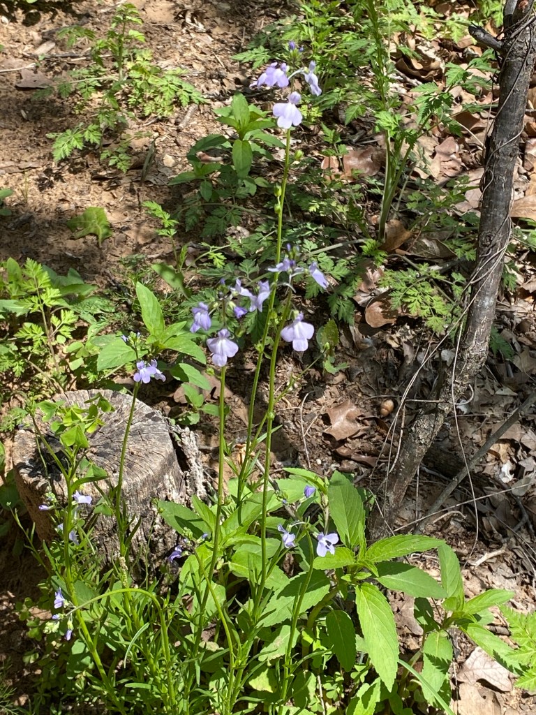 Many of the oaks were leafed out and a few stragglers were still putting out small leaves tinged in red. Along the trail’s edge there were some spiderworts with their deep blue flowers, three petals surrounding a cluster of yellow anthers. And everywhere I looked in the sandy soil of the hillside, it seemed that I saw Texas toadflax. I’ve really looked forward to this!