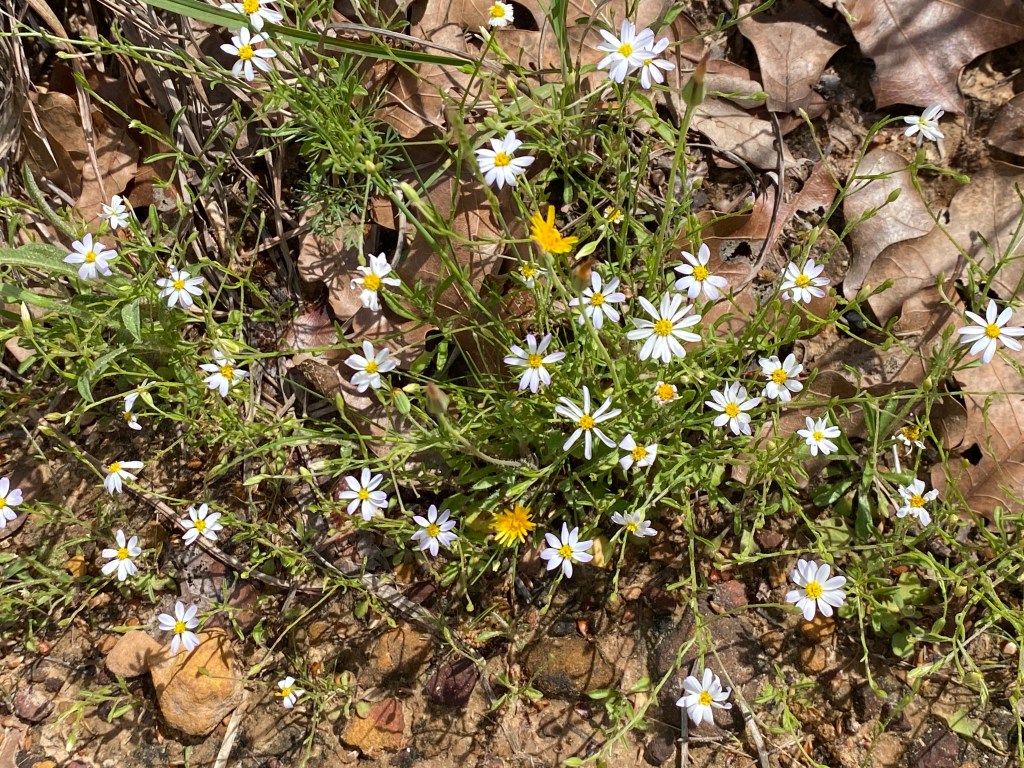 I walked the rest of the way to the bluff, along the way seeing beautiful yellow woodsorrel in a few places, with leaves reminding me of clover. Up on the bluff there were places with groups of what appeared to be leastdaisy, with tiny white flowers. It can be so rewarding to pay attention to little things like this, just stopping and maybe getting on hands and knees to get to know something small and magical.