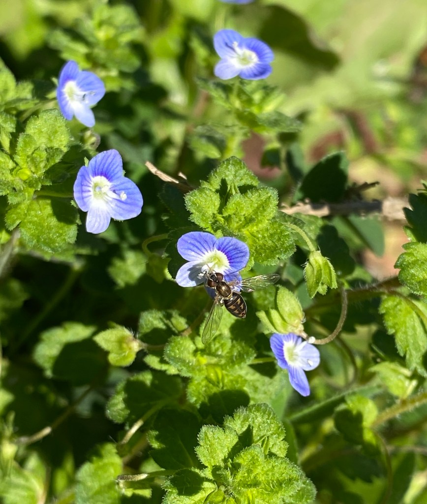 In my yard, when I looked down, I found a forest of little blue flowers among leaves of various shapes. In the midst of this two- to four-inch “forest,” the yellow sun of a dandelion shone. A honeybee visited the flower; dandelions are among the first flowers to feed the hive.