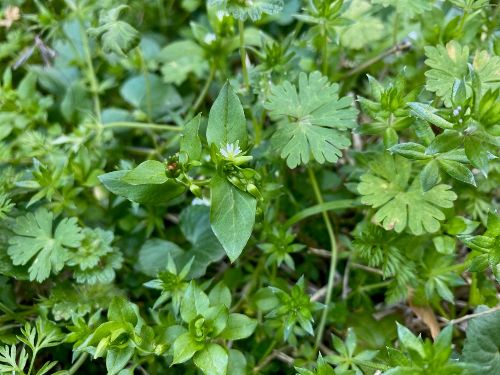 HenbitCommon chickweed in the center, with a four-lobed flower of field madder just to the right