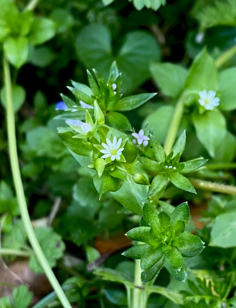 The ground was filled with such a beautiful jumble of green shapes. There were bigger, taller ones with leaves like umbrellas with notches and fingers. The appeared to be clusters of about four frilly leaves right at the top of the stem. There was chickweed with long, branching stems and arrow-shaped leaves. Nearby were plants with delicate stems with leaflets off to each side, in the way we think of ferns.