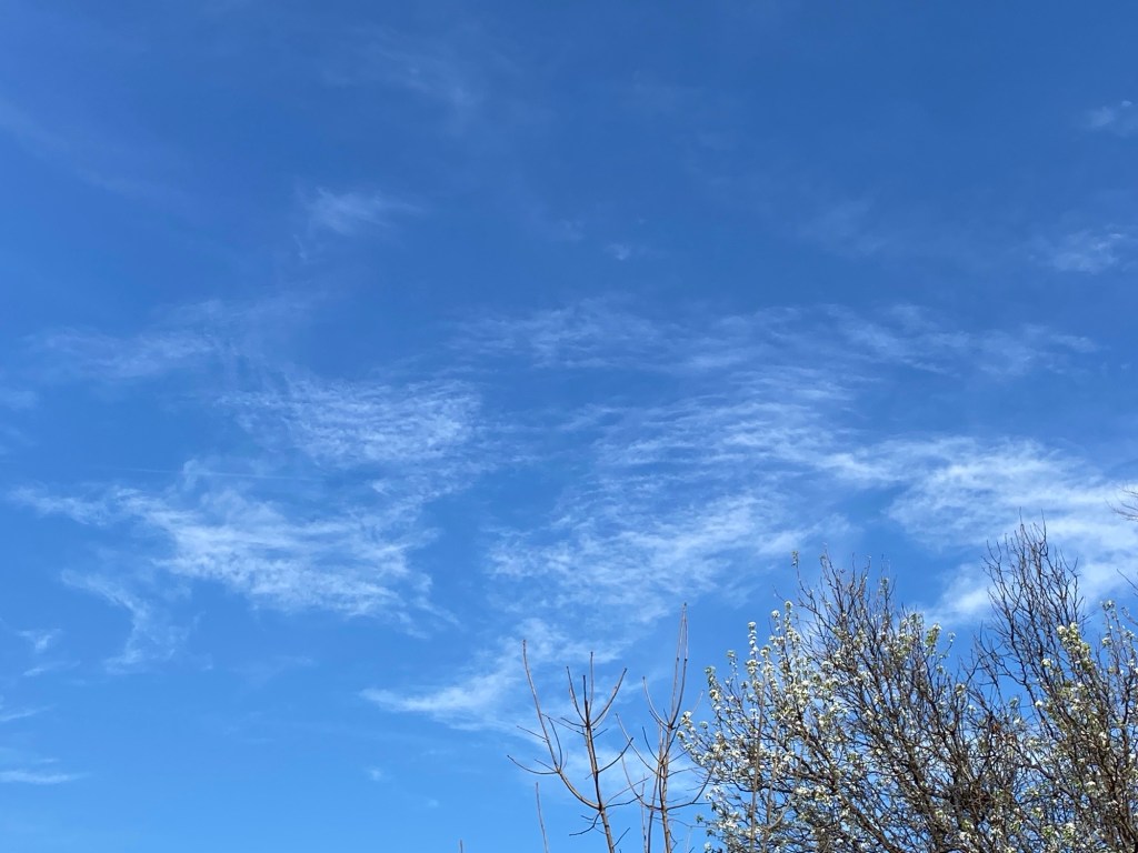 The clouds drifted, and a few had a hook or curve before stretching out southward or westward, caught and pulled by the currents flowing across the sky. This would be a great afternoon for lying back and watching how clouds are pulled along or drift with the upper winds. Yesterday they seemed in a hurry, but now their movement played out in slow motion.