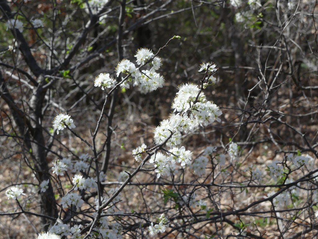 And then March arrived, and suddenly the plum trees were covered in clusters of white flowers. From a distance, other tree branches mostly looked gray and bare, but here and there you could see a slight green haze of budding leaves. Elbowbush was flowering. On the way to the north pond, when I looked closely I could see that most of the trees and shrubs were budding.