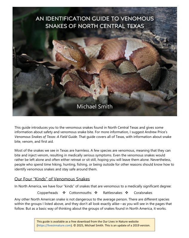 1. Identifying Venomous Snakes – Texas has several kinds of venomous snakes, and I’ve put together a free pdf guide to the ones found in north central Texas.