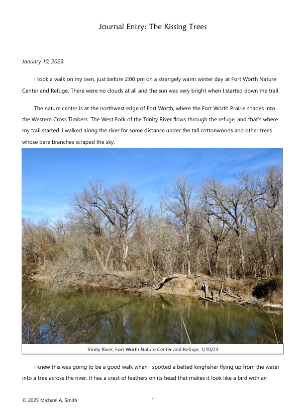 A winter walk along the river and into the woodlands at Fort Worth Nature Center and Refuge on a warm January day. There is a belted kingfisher and turtles in the river. Entering the woods, we come to the pair of trees with trunks curved around each other in a permanent embrace. At the end, at dusk, there is a surprise encounter with a great blue heron. (Click the image to the right)