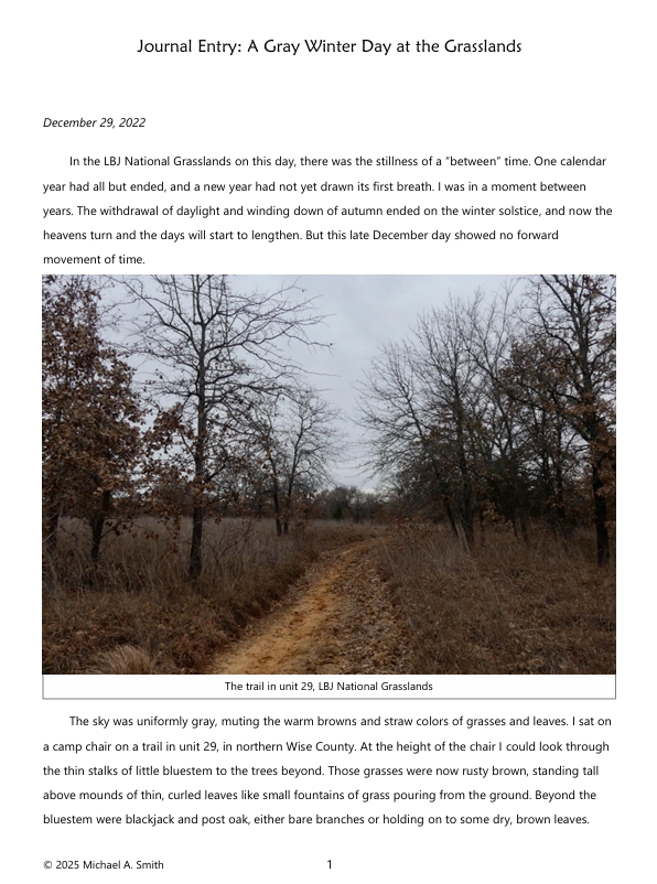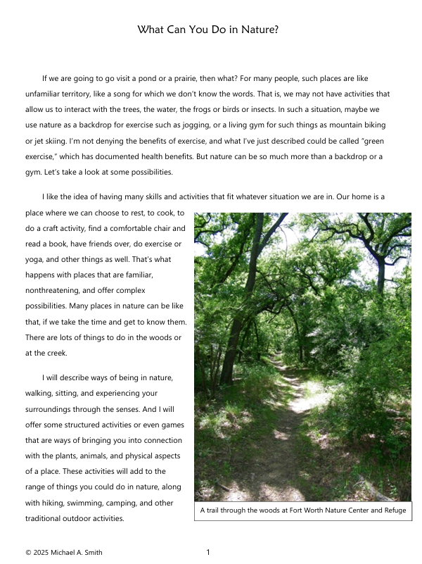 Would you like to get to know the woods and prairies in North Texas? Or add more depth to your walks in the wild? I’m writing something that might help. With the downloadable documents below, you can take a look at what naturalists do and pick up some ideas and skills for becoming one. You could also learn some ways to get more from the time you spend in nature.