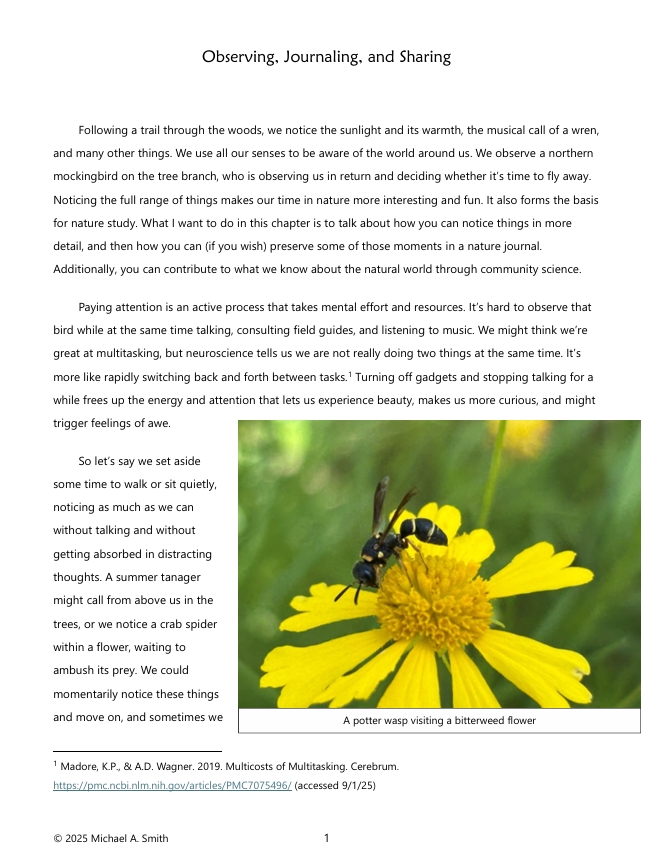 I provide some suggestions for slowing down and observing all the things to see, hear, touch, and smell during an outing. Then there is a discussion of nature journaling, which focuses us on our experience, helps us remember the outing, and can foster some self-reflection about our own perceptions and emotions during our visit to that place. I provide ideas and prompts for writing. Additionally, we can share our observations of various species online, contributing to community science. The discussion centers on the app “iNaturalist” but also touches on eBird and Merlin.