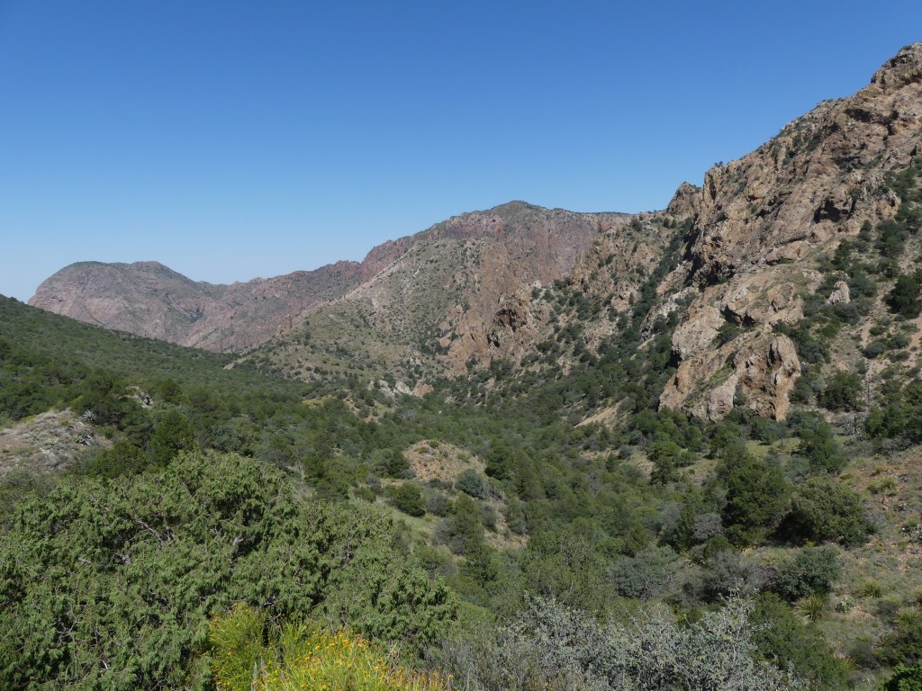 The next day, September 17, was our day to be in the Chisos Mountains. The Chisos is the only mountain range entirely contained within one national park. Driving up into “The Basin” within the mountains, the vegetation changes, reflecting slightly cooler temperatures and a little more rainfall. As you begin the climb into the mountains, you enter a woodland of small oak trees, junipers and pinyon pine. Tall slabs and columns of reddish igneous rock stretch toward the sky.