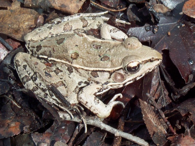 Toads have relatively dry, warty skin, shorter back legs compared to most frogs, and often live further from water than frogs. Most frogs, on the other hand, have slimy and fairly smooth skin and longer back legs – they can leap where toads only hop. Both frogs and toads are dependent on water or moisture and often live near the water’s edge or in places where there are moist refuges. Toads may live in fairly dry habitats like prairies (a few live in the desert). Frogs don’t have to stay right beside the water; at night in some places we might see leopard frogs or bullfrogs wandering some distance from the nearest creek or pond.